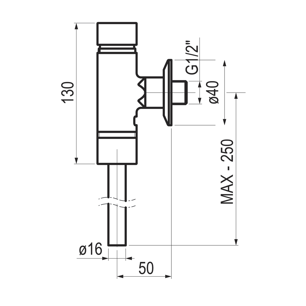 Entrada macho G1/2 y salida con juntas y tuerca racor para tubo Ø 16 mm.